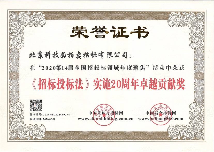 2020第14屆全國招投標(biāo)領(lǐng)域年度聚焦“《招標(biāo)投標(biāo)法》實施20周年卓越貢獻獎”(2020.5)