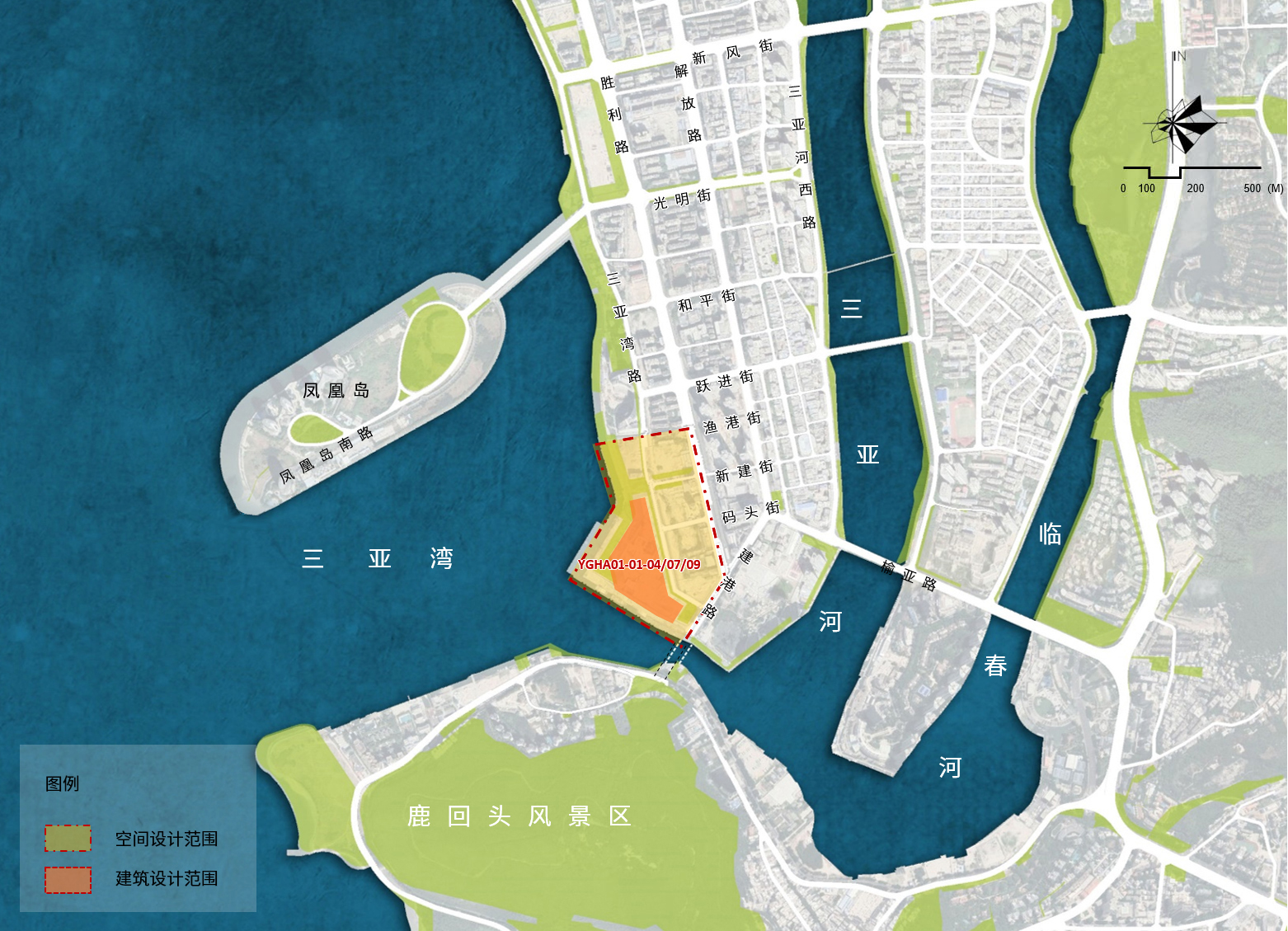 1.項目地點:三亞文化商務區(qū)(空間設計范圍)位于三亞灣鳳凰海岸南端,三亞河口區(qū)域,北至漁港街,南至建港路,東至勝利路。三亞國際藝術港(建筑設計范圍)位于三亞文化商務區(qū)YGHA01-01-04/07/09地塊。