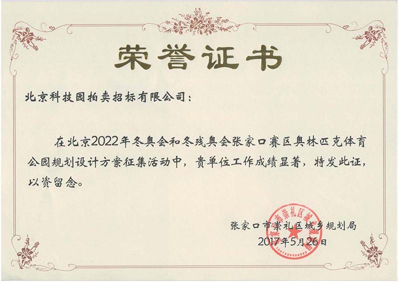 2022冬奧會和動殘奧會張家口賽區(qū)奧林匹克體育公園規(guī)劃設(shè)計方案征集榮譽證書