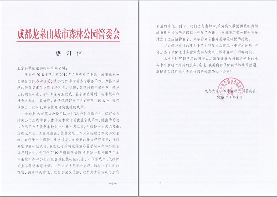 成都龍泉山城市森林公園管委會感謝信(2020.6)
