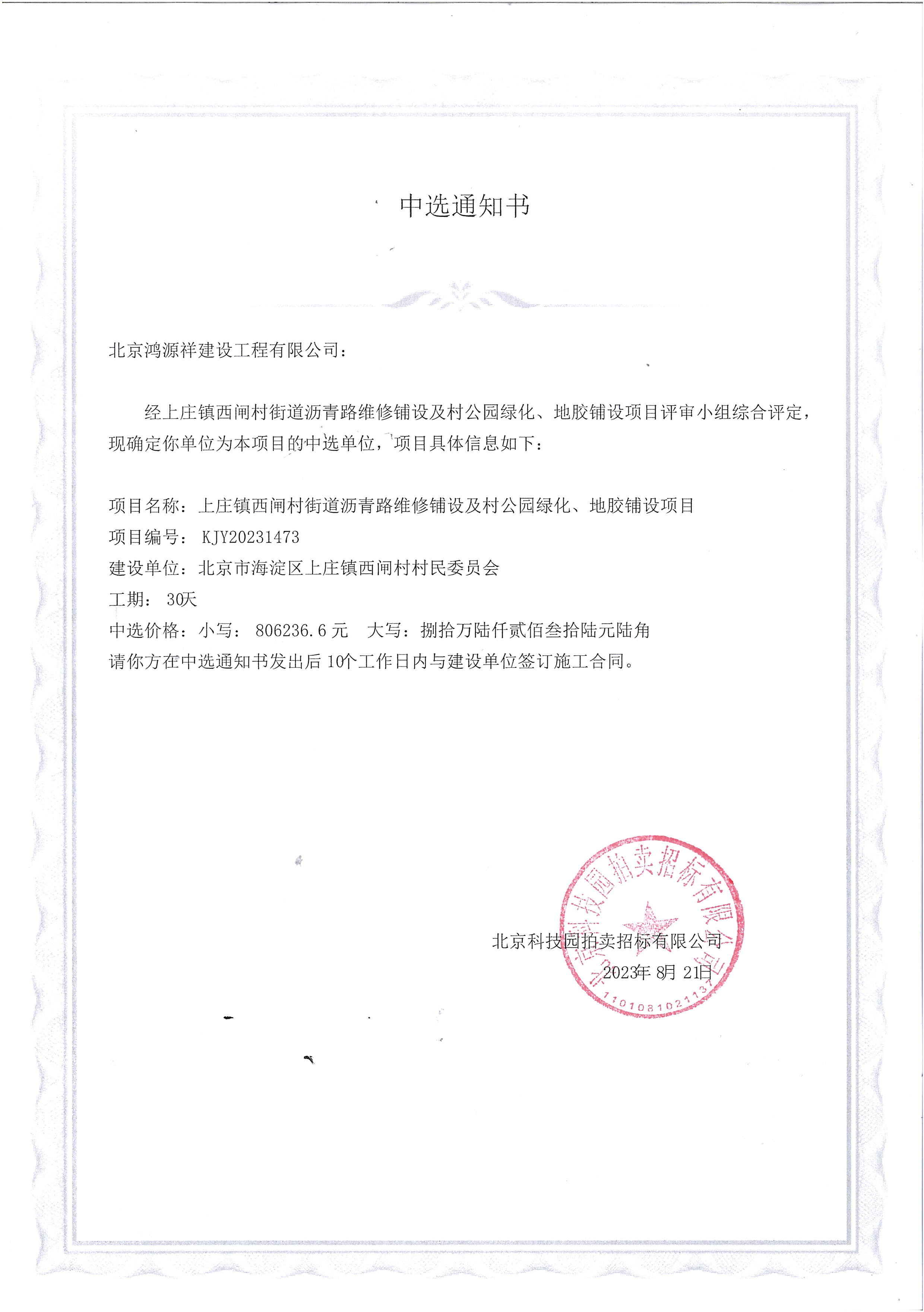 上莊鎮(zhèn)西閘村街道瀝青路維修鋪設(shè)及村公園綠化、地膠鋪設(shè)項目中選公告