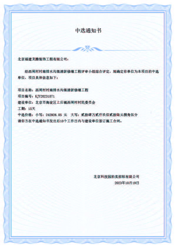 西閘村村南排水溝渠清淤修繕工程中選公告